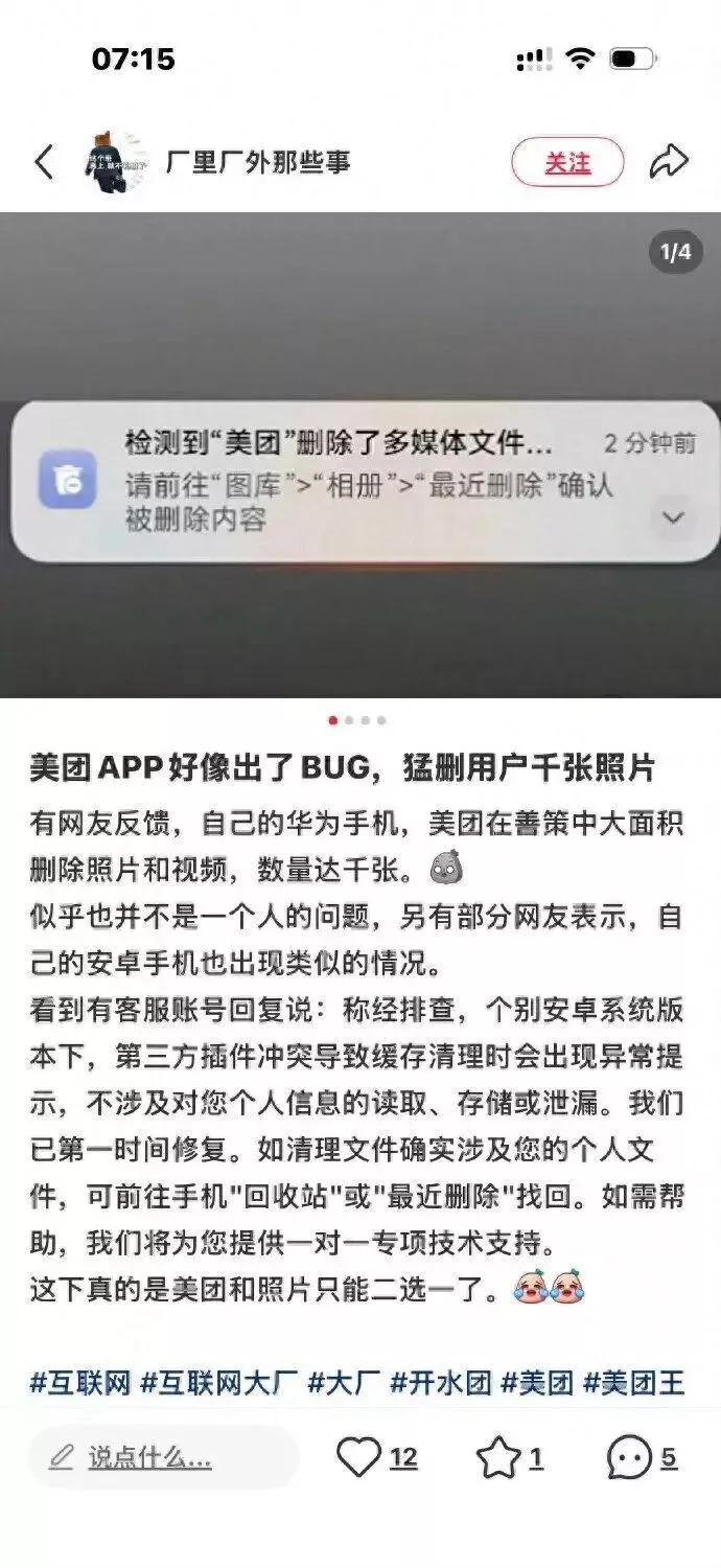 这场风波并非24号才突然冒出来的。早在前几天,就陆续有用户在社交平台发帖:正用着美团,手机突然弹出一条提示—— “美团正在删除图片和视频”,想拦都拦不住。有人看着自己攒了六年的504G照片、视频,就这么在眼前一点一点消失,怎么都止不住。更扎心的是,有些勉强恢复的文件也出现损坏、无法打开的情况,留下无法挽回的遗憾。