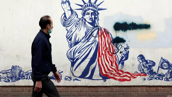 2月26日,伊朗德黑兰,前美国驻伊朗使馆旁的反美壁画前,一名伊朗人走过。