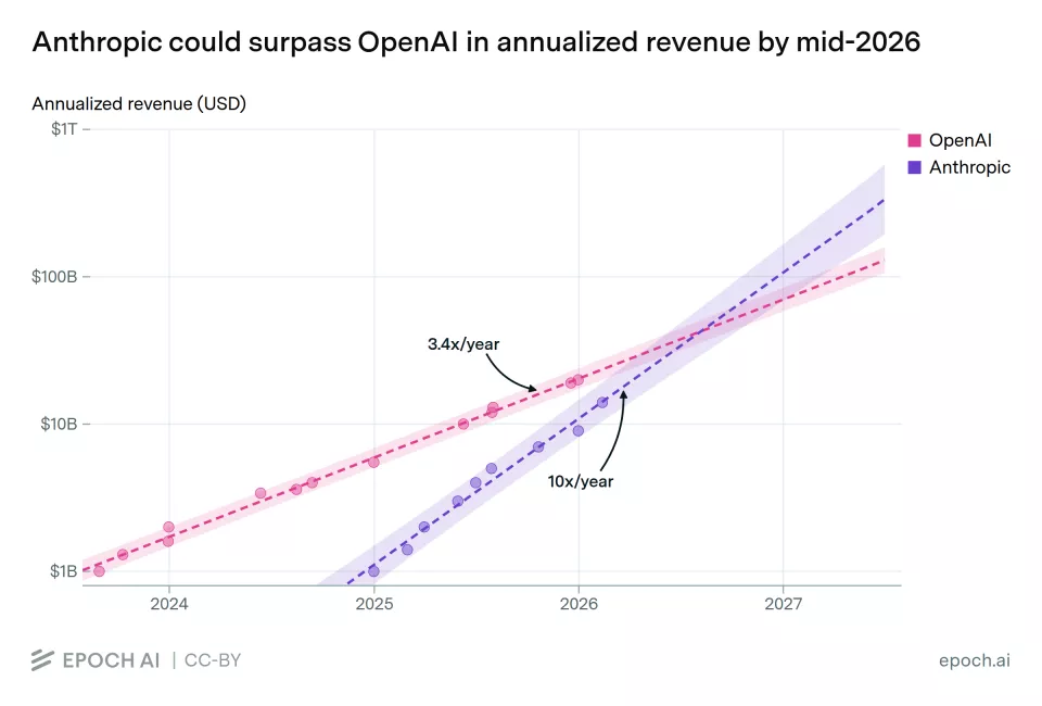 与此同时,Anthropic的融资规模同样惊人,2026年2月完成300亿美元G轮,估值380亿美元,但看起来它的收入结构更健康:约80%来自企业客户,年化收入已达约140亿美元,连续三年保持约十倍增长。研究机构Epoch AI预测,如果当前增长趋势持续,Anthropic的年收入可能在2026年下半年超过OpenAI。