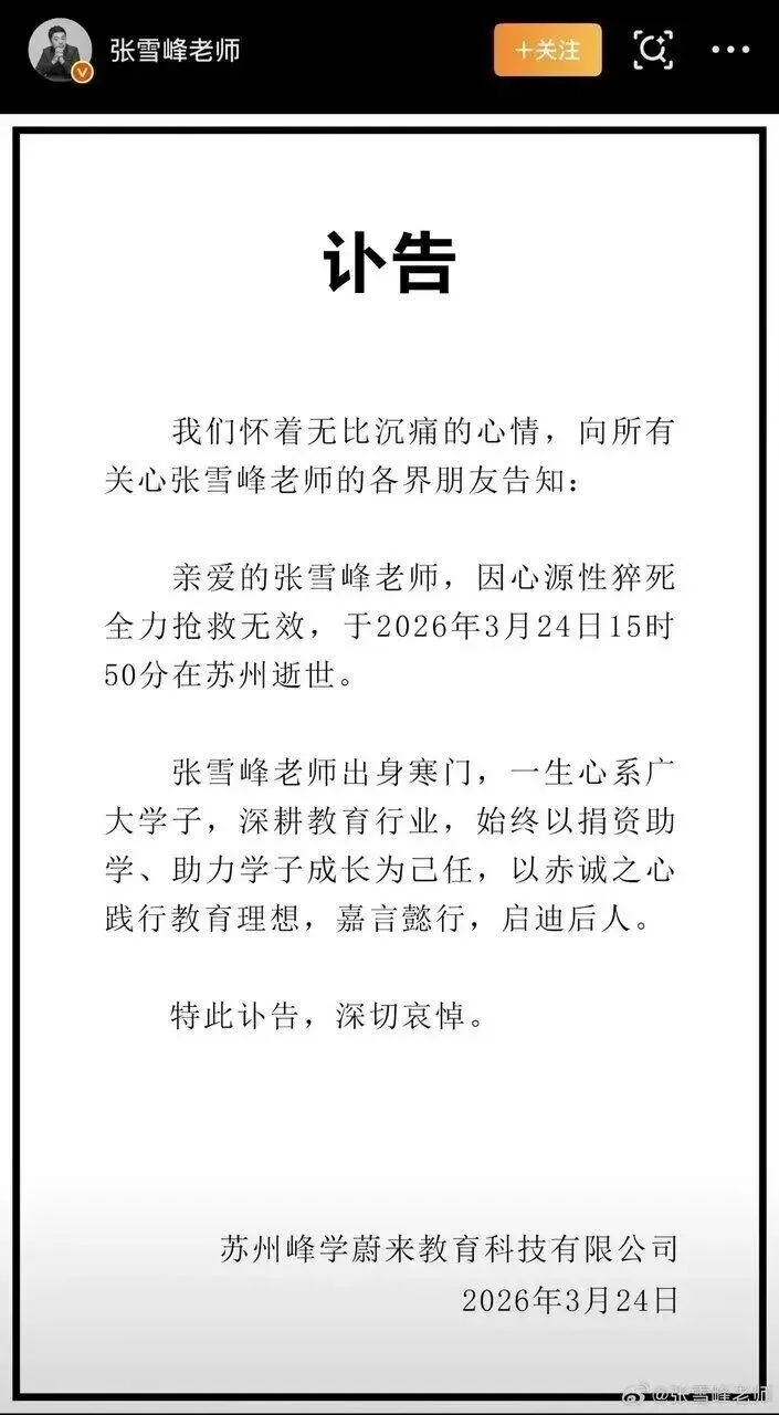 3月24日中午,张雪峰在苏州的公司里跑步后突然倒地。同事叫了救护车,但一切都太快了。当天下午3点50分,医院宣布抢救无效,心源性猝死,终年41岁。