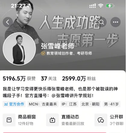 他的商业版图铺得很大。高考志愿填报是核心业务,2024年高考季,2万个名额3小时卖光,创下3小时收入2个亿的神话。2025年价格涨到12999元和18999元,照样抢光。他还搞研学、做直播带货、出书、投资半导体。他名下的公司长期存款过亿,他从不避讳谈钱。