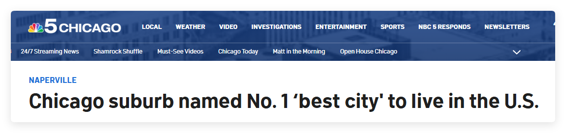 内珀维尔(Naperville)在该报告的“最宜居城市”排行榜上位列第一,这已是其连续第三年蝉联榜首。