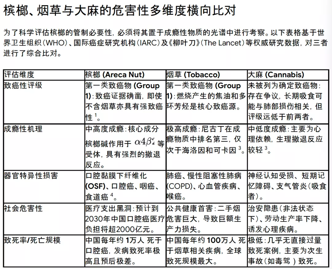 一个常识是:槟榔的危害与烟草大麻相比不遑多让,贴个Gemini的对比总结(图片如果太小看不清楚,可以点击看大图)。