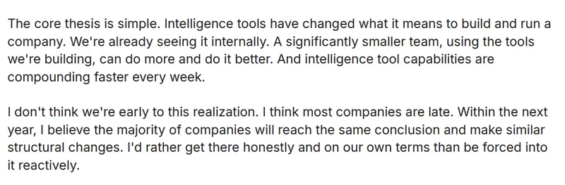 而管理层给出的核心判断是,智能工具已经改变了建立和运营一家公司的方式,一个显著更小的团队,借助这些工具,可以做得更多,而且做得更好。