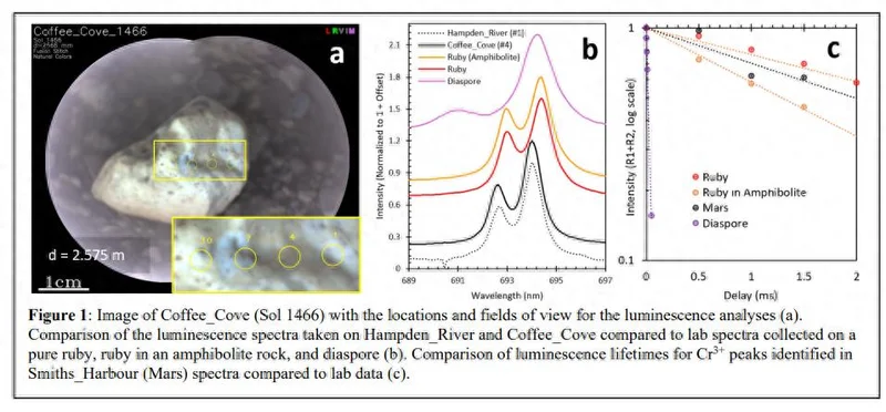 该仪器通过发射两种不同的激光烧蚀岩石表面或诱发荧光,再由相机捕捉产生的光谱。测试结果显示,名为“汉普登河”的岩石光谱特征与实验室中的红宝石几乎完全一致。随后,团队在“咖啡湾”和“史密斯港”另外两块标本中也发现了刚玉的踪迹。