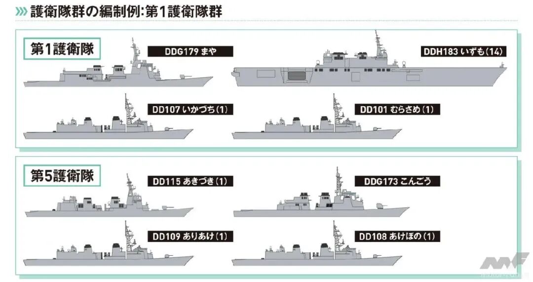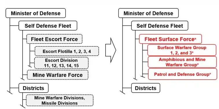 根据日本防卫省公布的计划,原有的4个护卫队群被整合重组为3个水上战群。在旧体制下,每个护卫队群由1艘直升机搭载护卫舰、2艘宙斯盾舰和5艘通用护卫舰共计8艘舰艇构成。新体制维持了整体舰艇数量与人员规模的大致不变,但将力量集中于更少的作战单位。