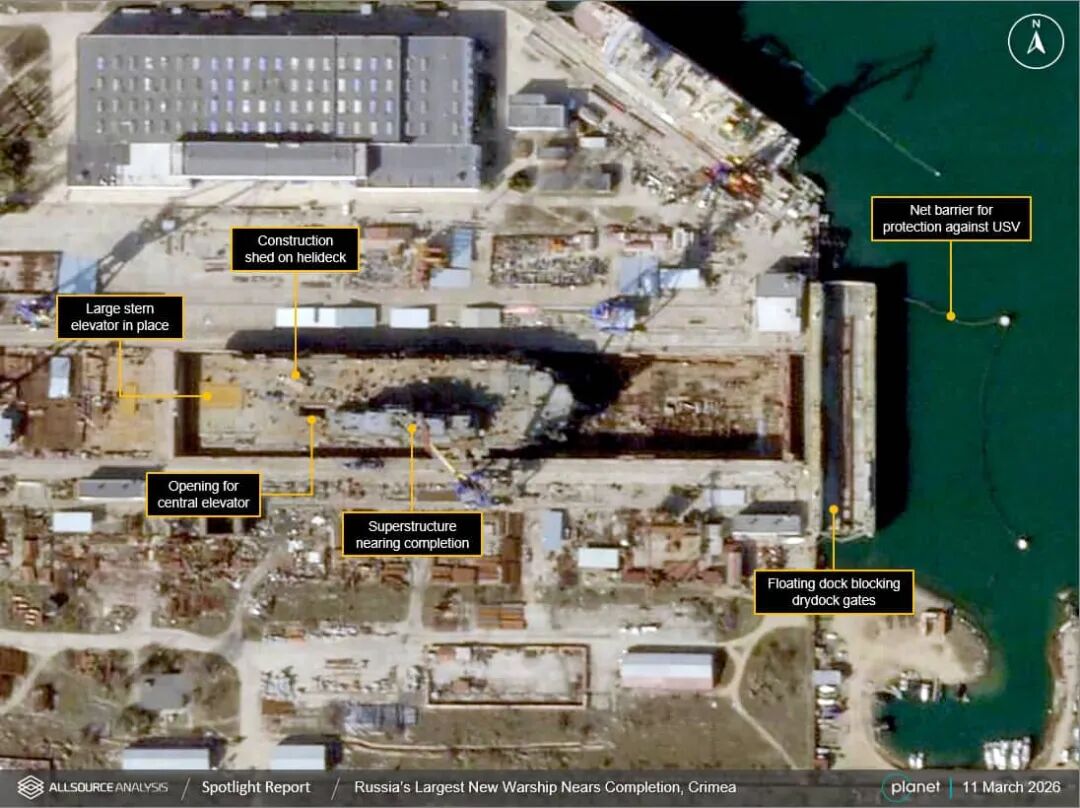 据海2026年3月23日报道,根据2026年3月11日拍摄的卫星图像分析,俄罗斯海军伊万·罗戈夫号两栖攻击舰位于扎利夫造船厂唯一可用的干船坞中,其上层建筑已经完成,船体已接近完工,即将达到可以下水的节点。