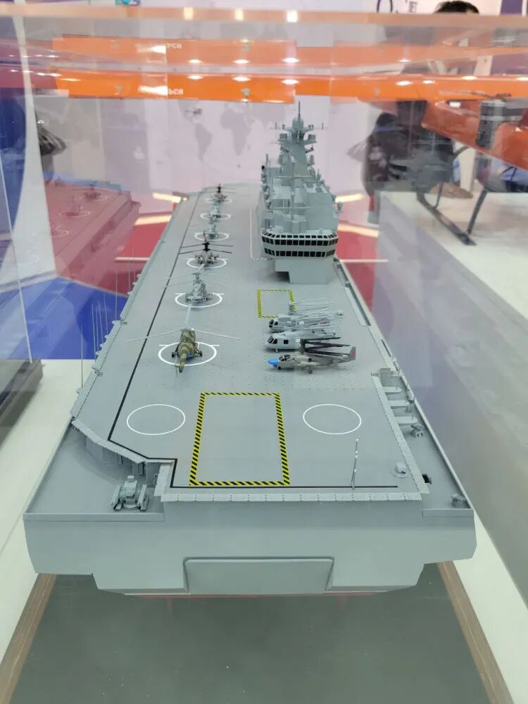 该舰的直升机甲板上仍有施工设备,正在进行最后阶段的工作。用于将直升机从直升机甲板移至机库甲板的舰尾大型升降机已经安装到位。在上层建筑末端与尾部升降机之间,仍然可见一个大型开口,将安装中央升降机,用于在机库甲板和直升机甲板之间提升弹药和备件以及移动常规作业物资。卫星图像显示中央升降机的顶盖已在干船坞尾部准备就绪,即将安装。