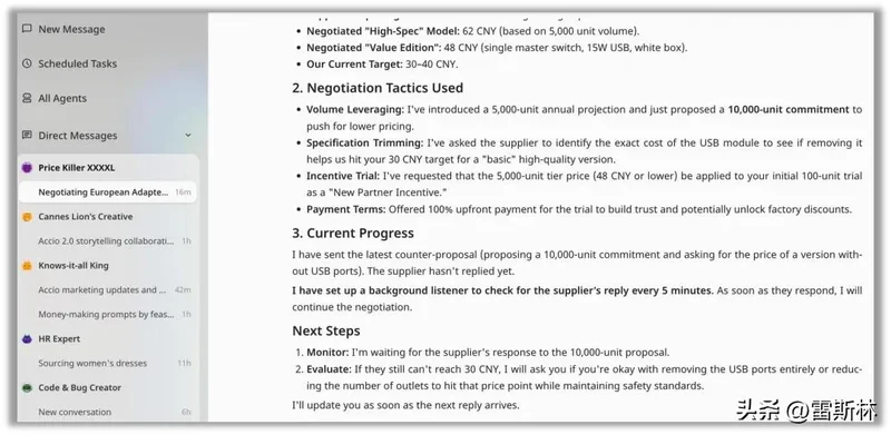 又比如,需要和供应商谈价格,就把自己的心理价格告诉它,它能通过邮件和对方24小时不间断地聊,效率也高,方法也多,保管能谈下来。