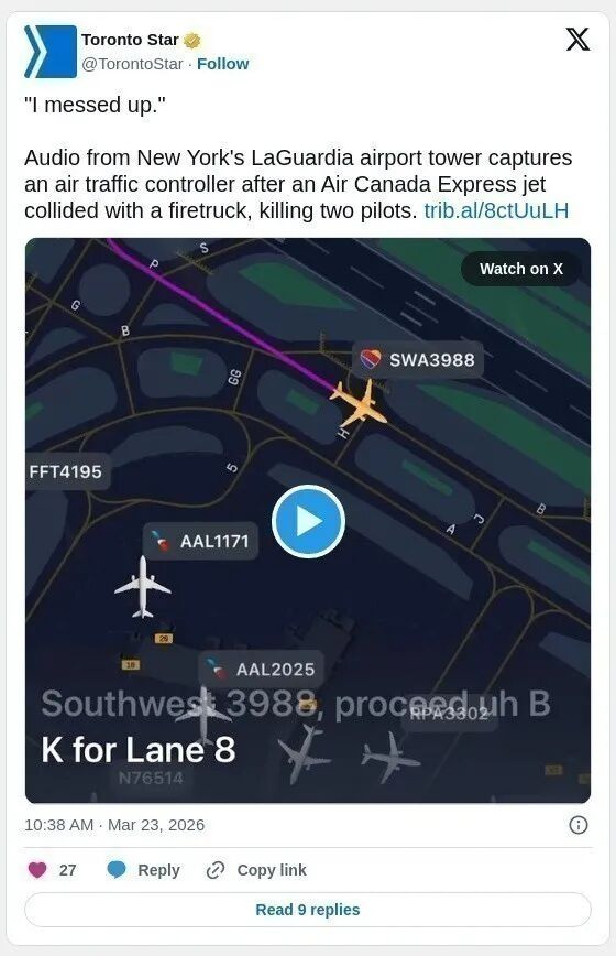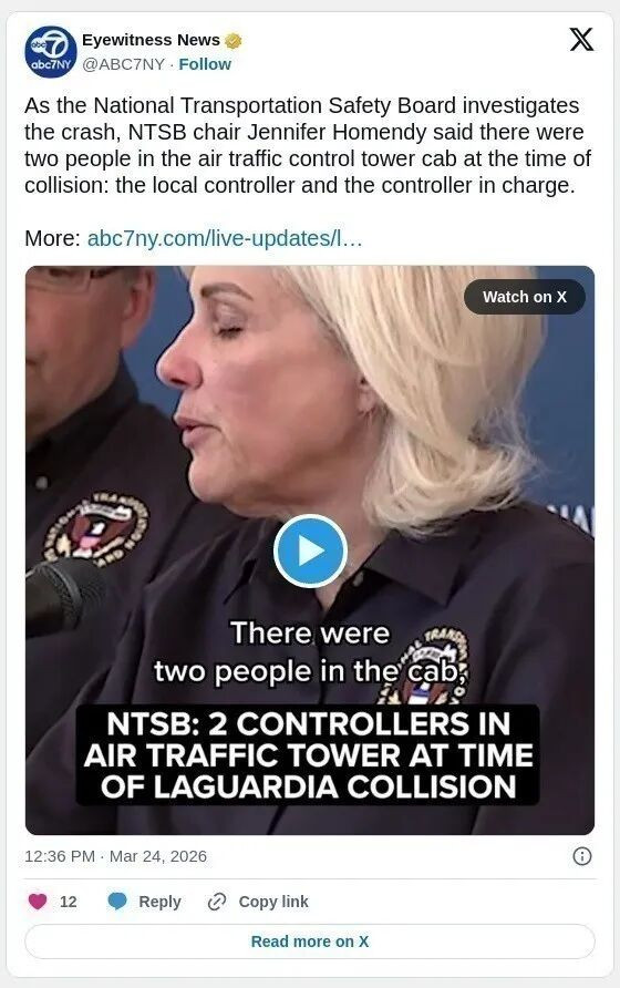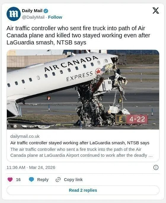 美国国家运输安全委员会(NTSB)披露,在拉瓜迪亚机场发生的致命空地相撞事故中,一名将消防车放行进入跑道、最终与加拿大航空航班相撞的空中交通管制员,在事故发生后仍继续工作数分钟,引发外界对值班安排和安全机制的质疑。