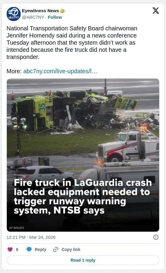 调查发现,涉事消防车并未配备应答器(transponder),导致空管只能依赖精度较低的雷达信号判断其位置,可能影响对现场态势的掌握。