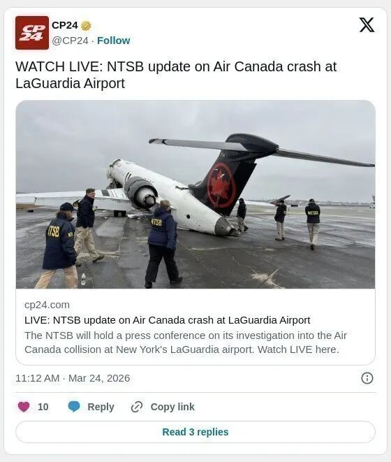 美国国家运输安全委员会在今天的新闻发布会上表示,涉事的加拿大航空Jazz航班当时已获准降落,且处于稳定进近状态;与此同时,一辆消防车也被允许穿越4号跑道。就在飞机即将接地前的最后几秒,塔台才紧急下令消防车停车,但为时已晚。