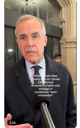 总理卡尼今天表示,他对加拿大航空公司发布的一段视频感到“非常失望”。