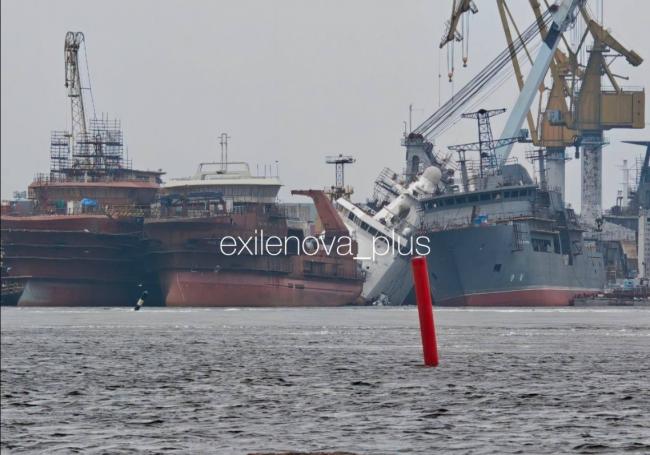 第二天,发布在电报频道的照片显示,这艘白色的船严重倾斜,倚靠在其他大型船边,似乎船体的一部分已经沉入水中,可惜拍摄角度不够好,无法确定。
