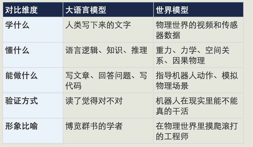 【一句话】 大语言模型懂「说话」,世界模型懂「做事」。