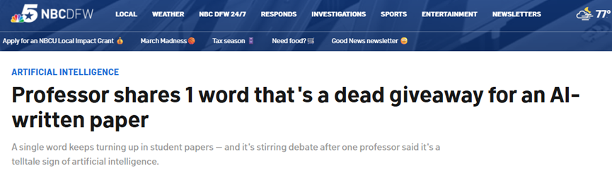 他分析道,原因很简单。在他所教授的社交媒体与个人品牌建设课程的学生中,其典型的写作风格是随意、短句式,这个词极少出现——因此,它近期在论文中被反复使用就格外显眼。