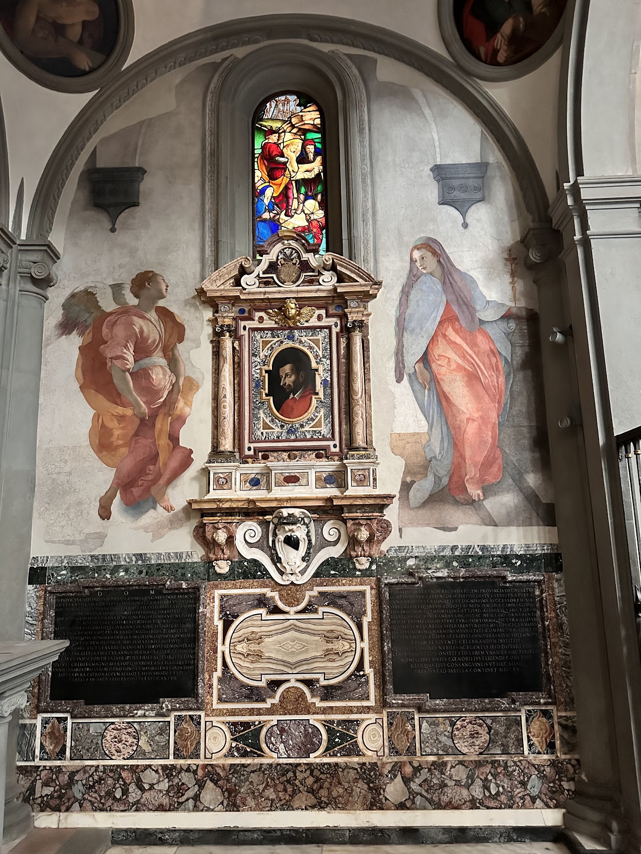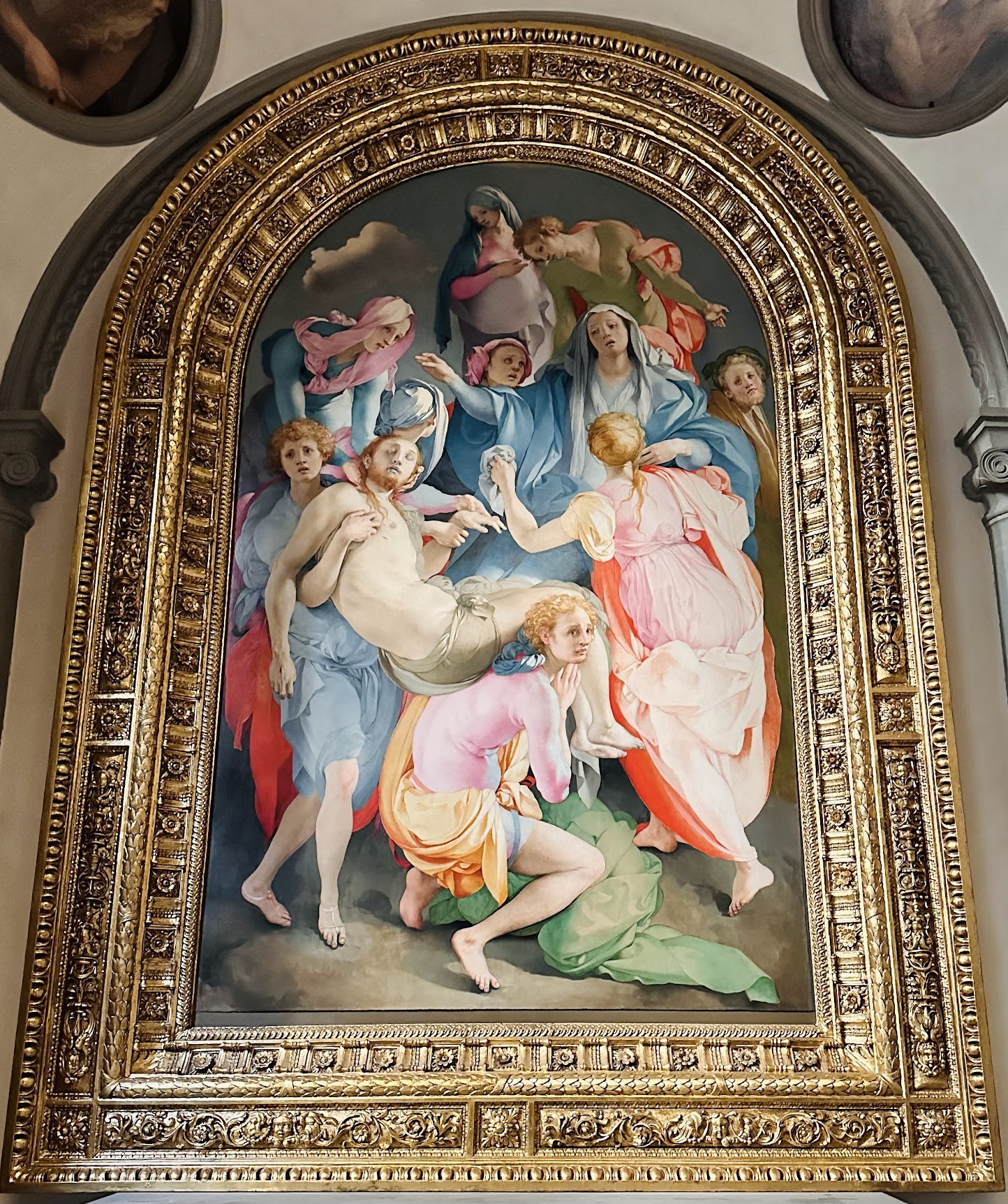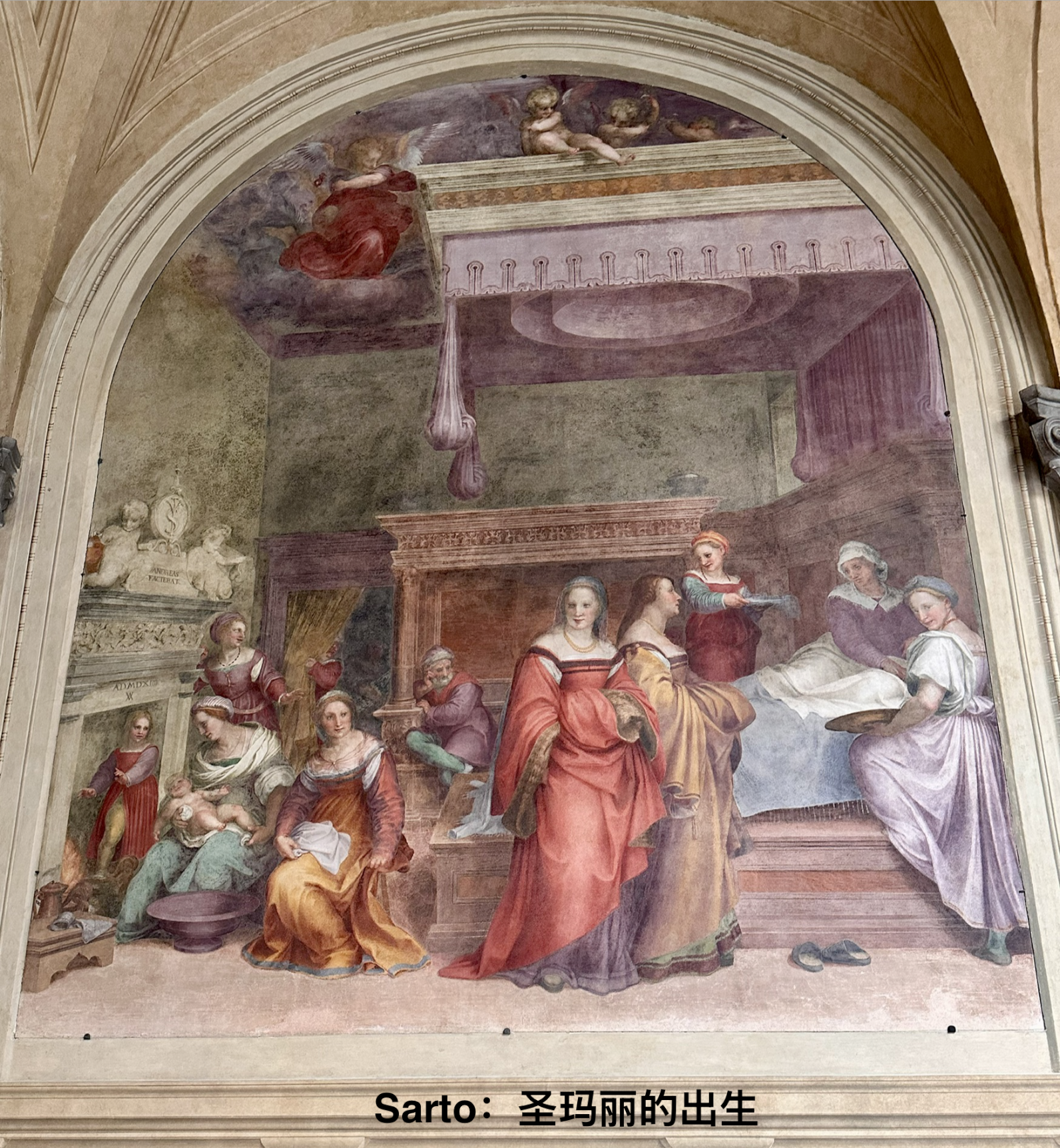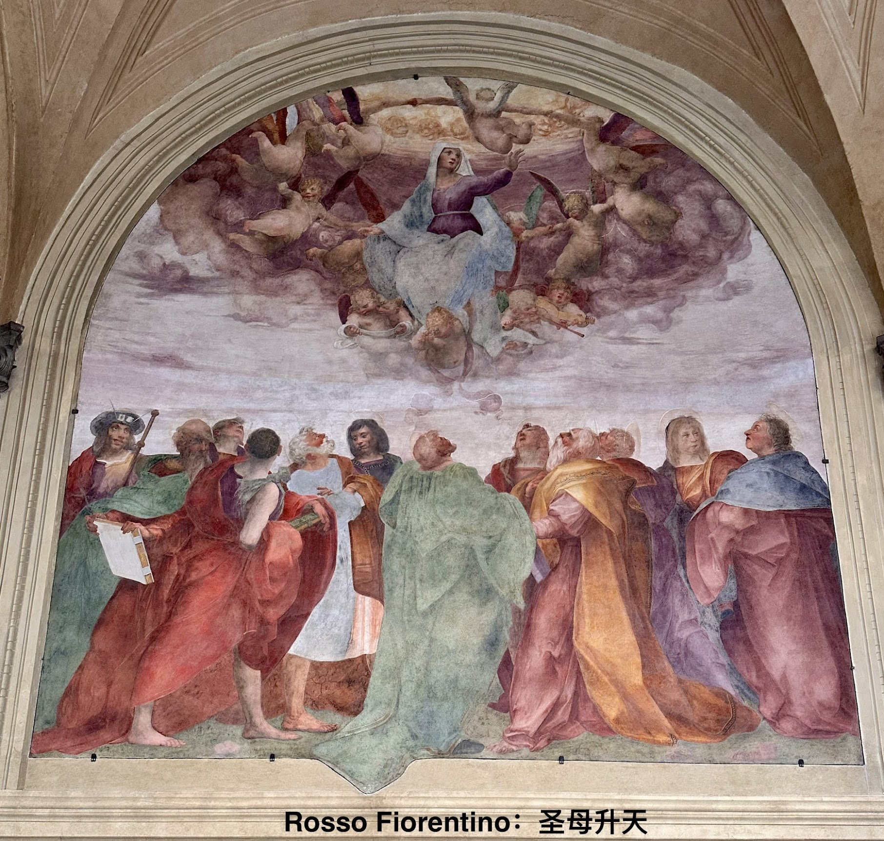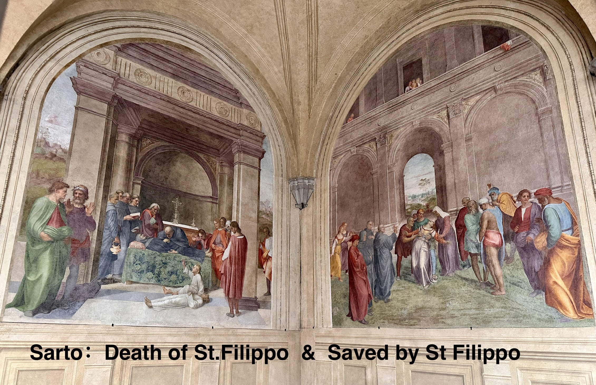 1513年为庆祝美第奇家族首位教皇利奥十世(他也是建圣彼得大教堂的主要sponsor、还为此发行了赎罪卷并催生了路德新教)去罗马赴任,赞助者要求尽快完成剩余绘画,萨尔托让两名年轻的学生蓬托尔莫和菲奥伦蒂诺Fiorentino独立绘制了两幅壁画,佛罗伦萨第一代怪才由此诞生,而小回廊这十二幅壁画也成了Mannerism的试验场,后来甚至出现了“圣母领报学校”一说。