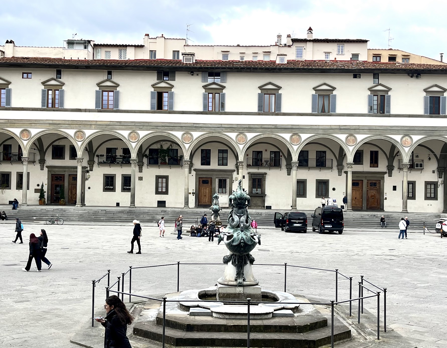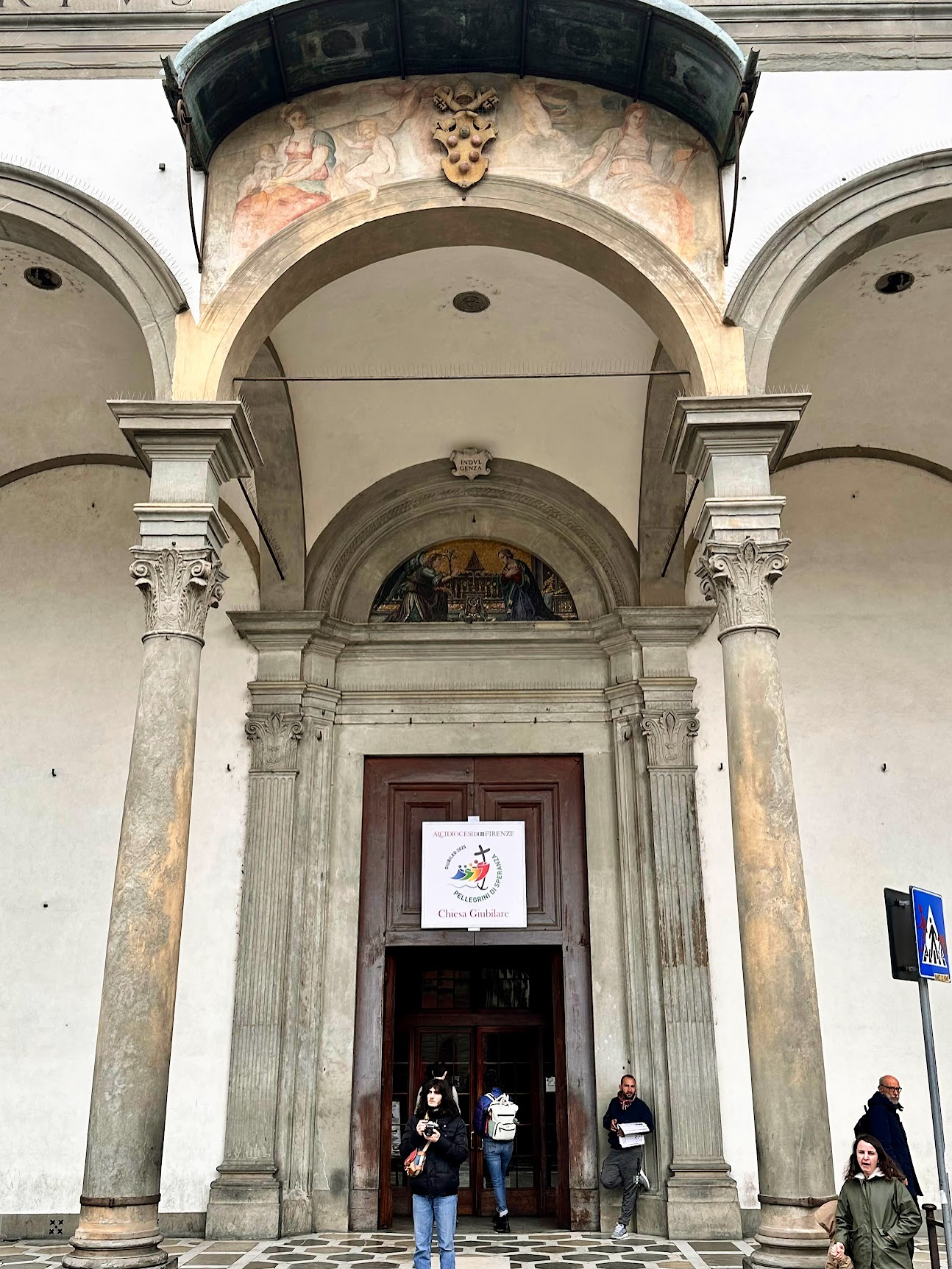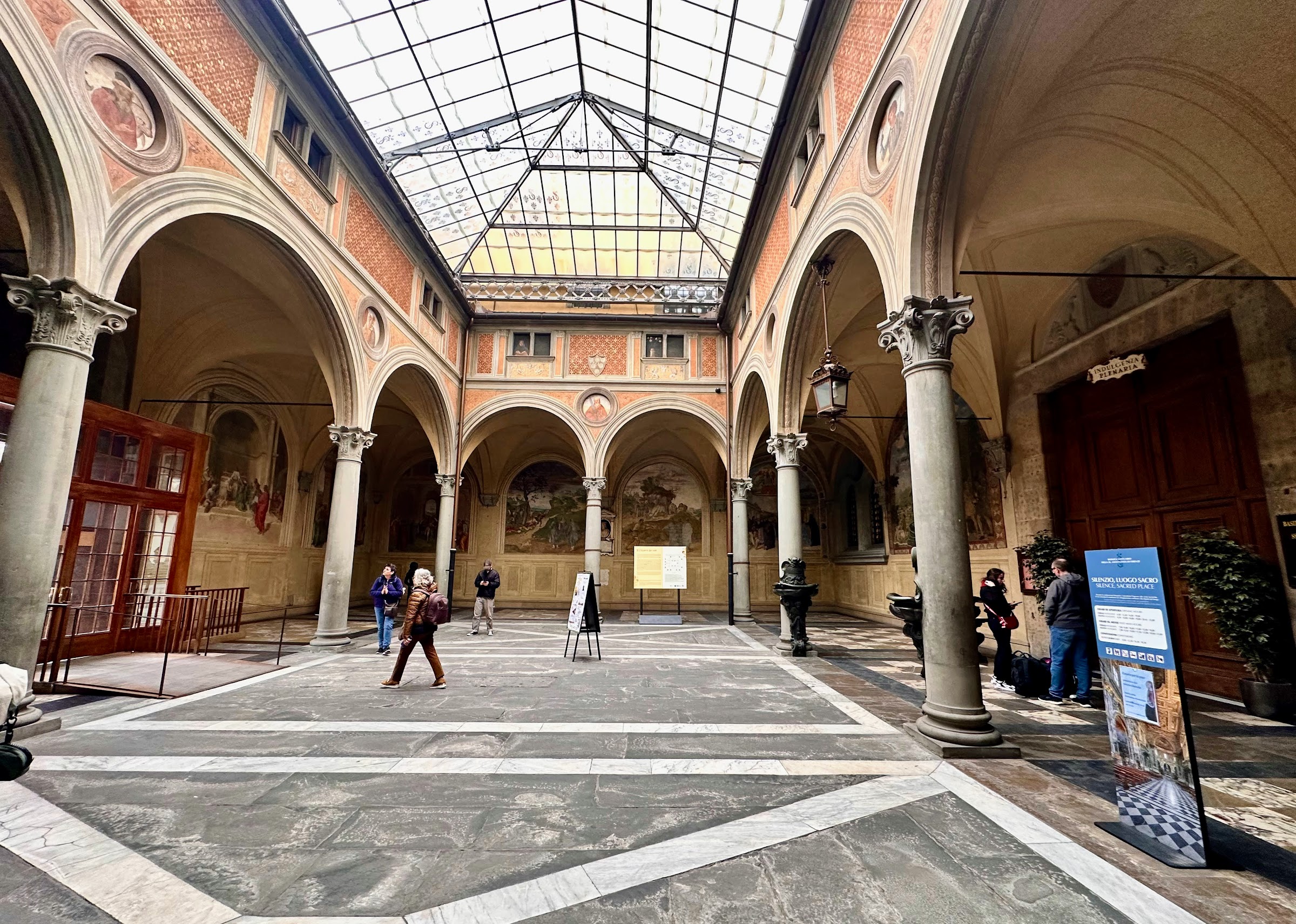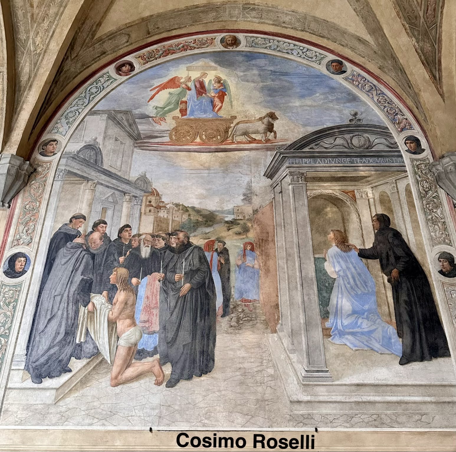 两百年后,建筑大师米开罗佐Michelozzo设计了圣殿的前回廊庭院Chiostrino dei Voti;装饰工程进展缓慢、直到1509年萨尔托开始主导回廊的绘画,他仅用一年就完成了「圣菲利普的奇迹 Adorazione S.Filippo」。