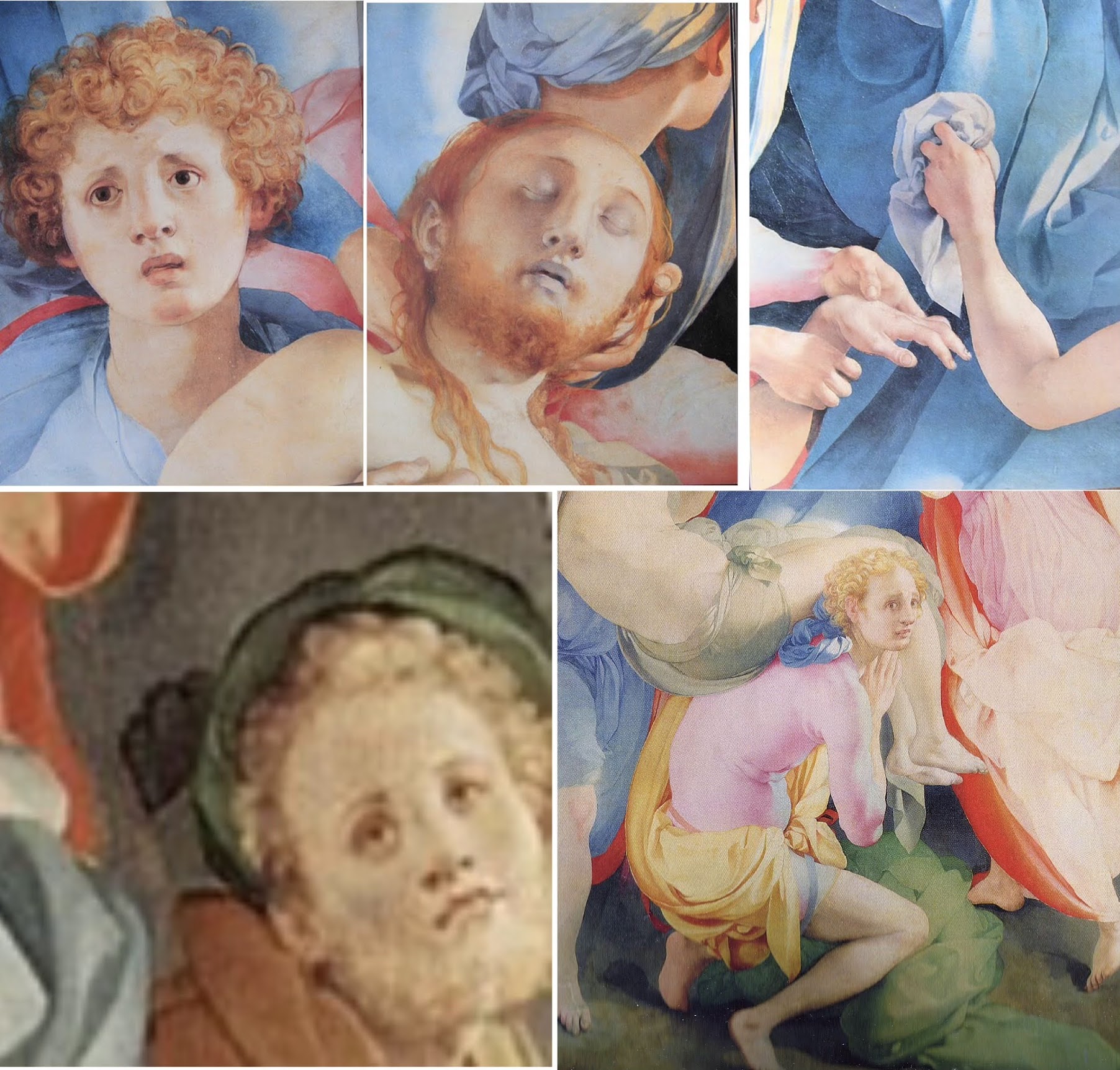Deposizione部分细节:左上和右下是抬着耶稣的少年,右上是给圣母拂泪的手帕,左下是画家本人