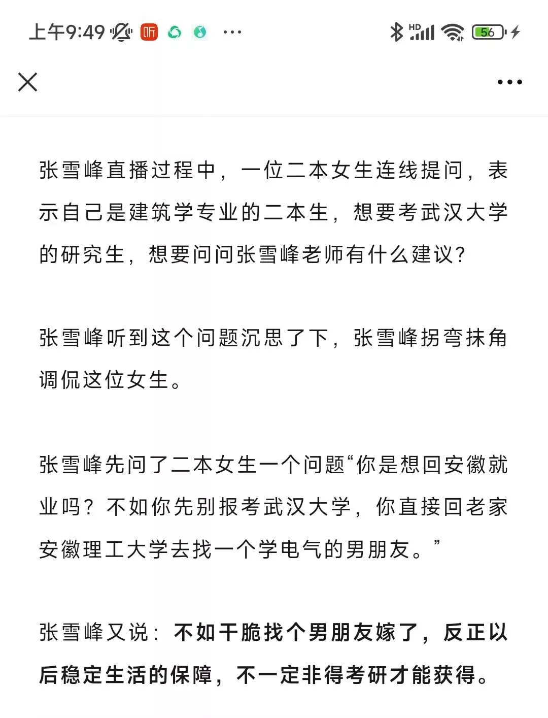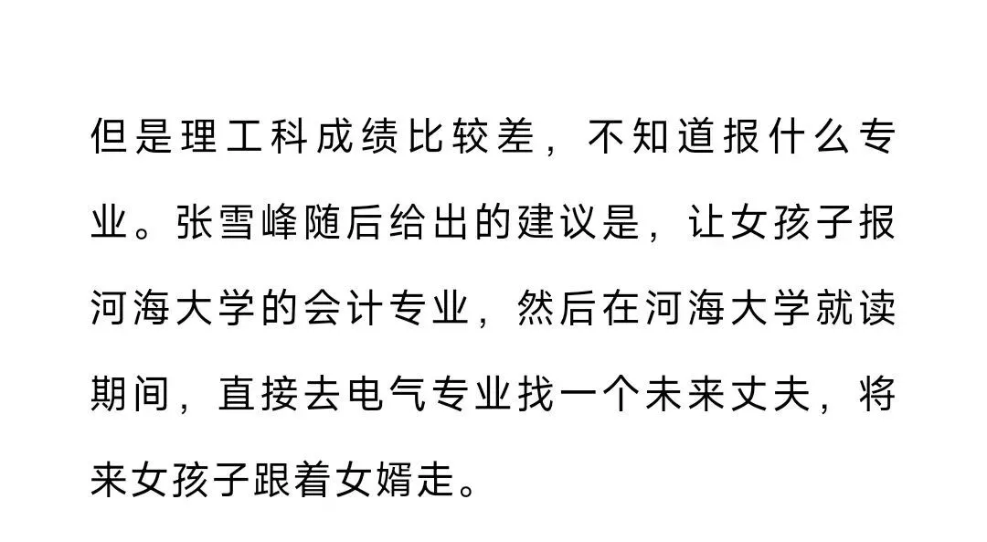 而最让我反感的,还是张雪峰的性别观。这主要体现在他对女生的求学建议中,有一个高频词:找男朋友。简而言之,不管女生是否征求婚恋建议,张雪峰都会“附送”他的婚恋观给你,其要点是让你找个男朋友然后跟着他。——这样的建议他从来不会对男生说。