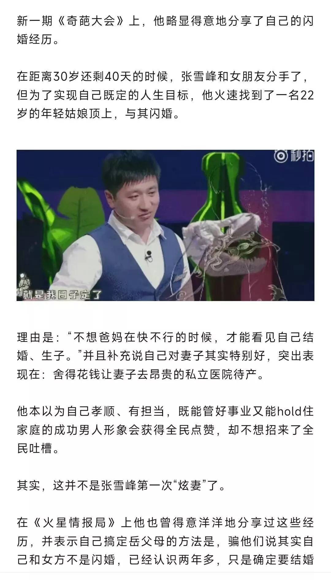 张雪峰的性别观还体现在他个人的婚恋中,他曾多次(骄傲)分享自己的经历,即妻子比自己小7岁,是闪婚。他对妻子特别好,因为舍得让妻子去昂贵的私立医院待产。