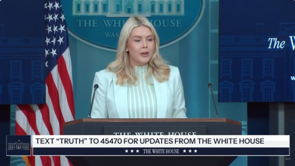 2026年3月25日,白宫新闻秘书莱维特(Karoline Leavitt)主持新闻发布会。 (图片来源:白宫youtube)