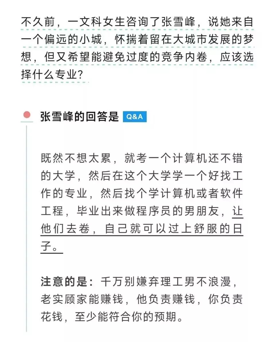 我有一个朴素的观点,一个人的人生——哪怕已在底层——需要自己来考量,任何人都只是建议,不能替代对方做决定。但张雪峰说的话往往越界,他主要是在给家长提供(强势)意见(剥夺孩子选择的权利,对孩子的成长不利),他更多考虑生存需求而不兼容兴趣(过于功利的选择很少有人能长期坚持,即使能坚持生活质量也低)…..这些都是我反对的。