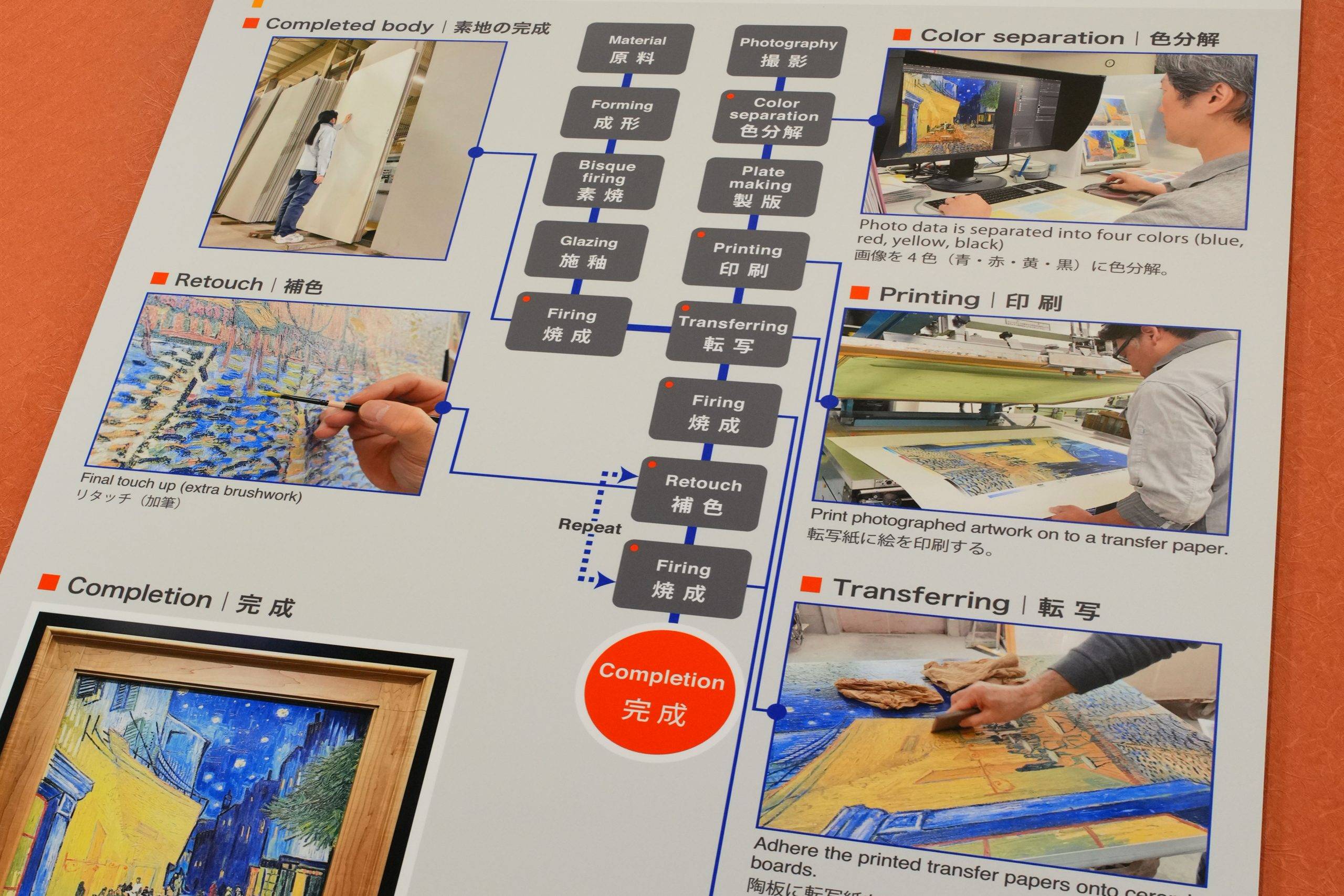 陶板的制作流程近乎苛刻,制作团队需要赶赴全球各地的美术馆和历史遗迹,实地拍摄与测量。例如在意大利帕多瓦的斯克罗维尼礼拜堂,制作团队历经四次实地考察与测量,还需将试制品运至现场进行照明测试,确认质感与色调。回到日本后,制作团队要解析色彩、转印、以上千度的高温烧制,再由匠人手工润饰,进行二次烧制。