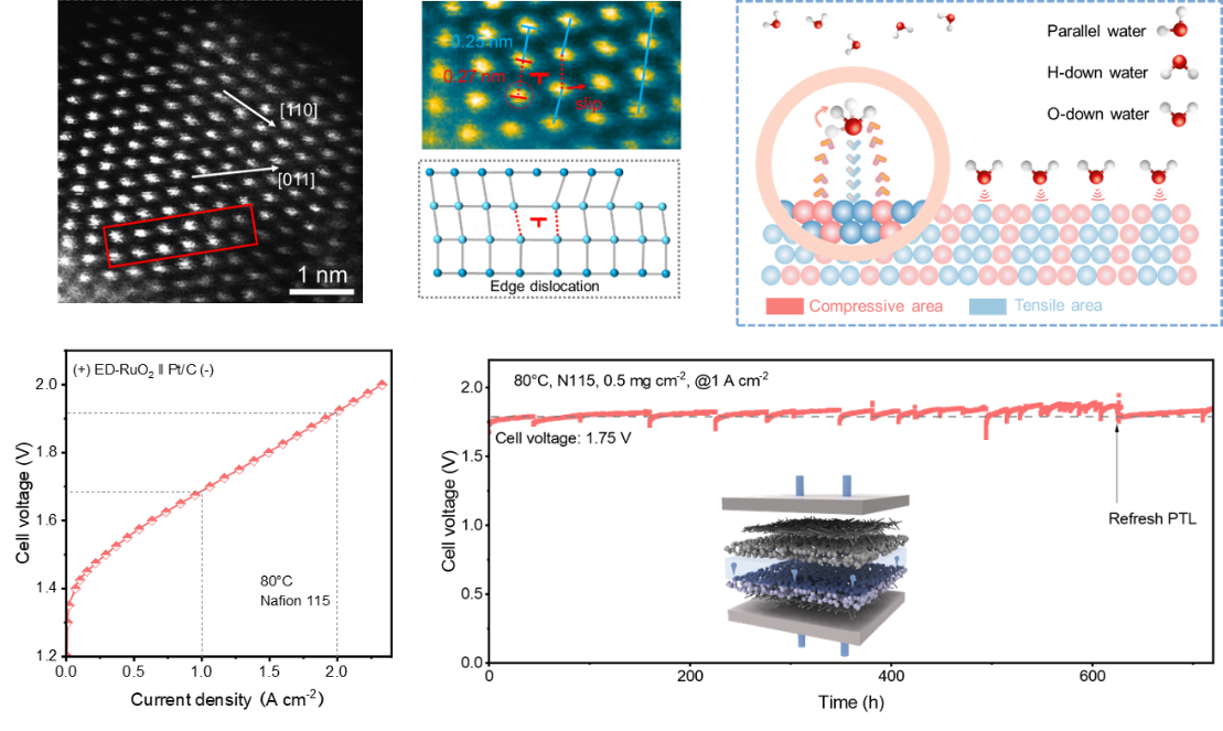 针对上述难题,研究团队提出了一种“定向水分子构型”策略,通过直接优化界面水分子的排列方式,在具有边缘位错结构的RuO2催化剂中成功诱导界面水分子形成有序的“氧端朝下”构型。该特殊结构源于位错区域中压应力与拉应力的协同作用:压应力排斥氢端吸附,而拉应力增强对氧端的吸引,从而诱导水分子有序排列。