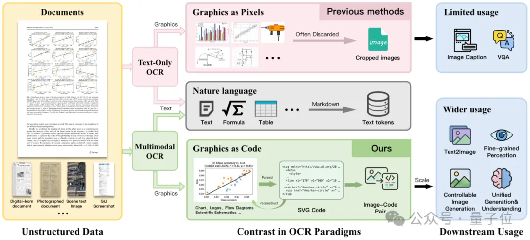 左边是传统路线:文本走OCR管线变成Markdown,图形直接裁成像素图——要么丢弃,要么只能做图像描述(caption)和视觉问答(VQA)这类粗粒度应用。右边是MOCR的路线:图形被解析为SVG代码,和文本一起形成图像-代码配对数据,可以直接用于文生图、细粒度感知、可控图像生成、统一的生成与理解等更广泛的下游任务。