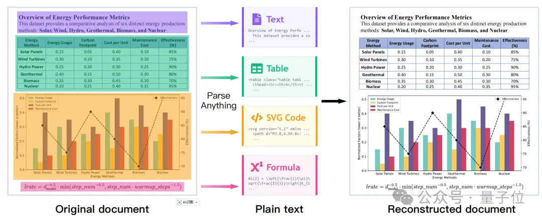 它提出了一个大胆的新范式:不只识别文字,而是「解析一切」——文字、表格、图表、公式、流程图、化学结构式、UI组件……通通变成可编辑、可渲染的结构化代码。用论文的话说,这是把文档图形从「二等公民」升级为「一等解析目标」。
