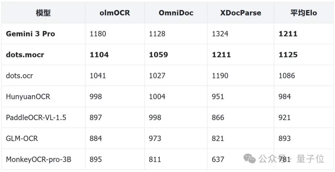 在OCR Arena的Elo评估中,dots.mocr在olmOCR-Bench、OmniDocBench 1.5和XDocParse三个主流基准上均拿到了开源模型第一名,平均Elo达到1125,仅次于闭源的Gemini 3 Pro(1211)。需要强调的是,dots.mocr只有3B参数,而它打败的对手中不乏同等甚至更大规模的专用OCR模型。