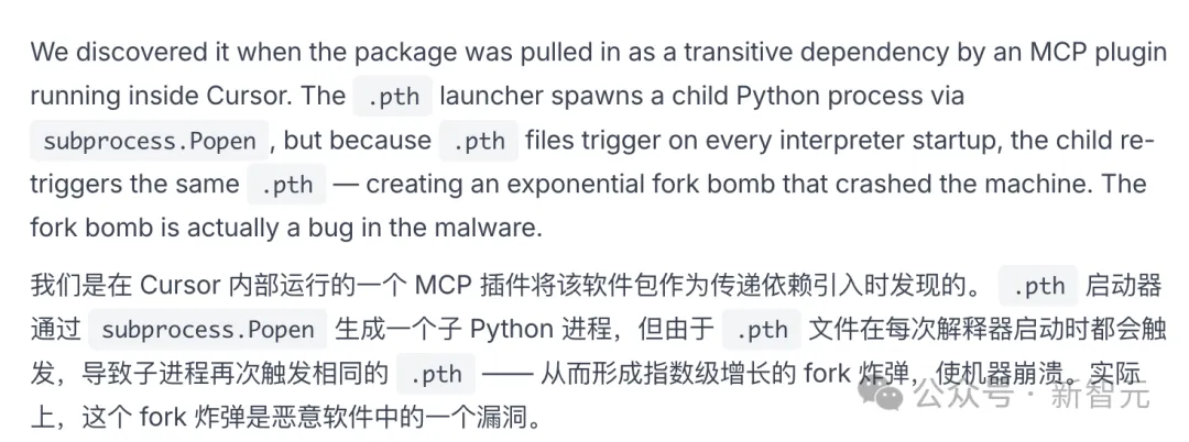 因为子进程本身也会再次触发同一个.pth文件,于是每个新进程都会再生出新进程,进入指数级自我复制,最后演变成一个fork bomb,把机器资源迅速吃光。