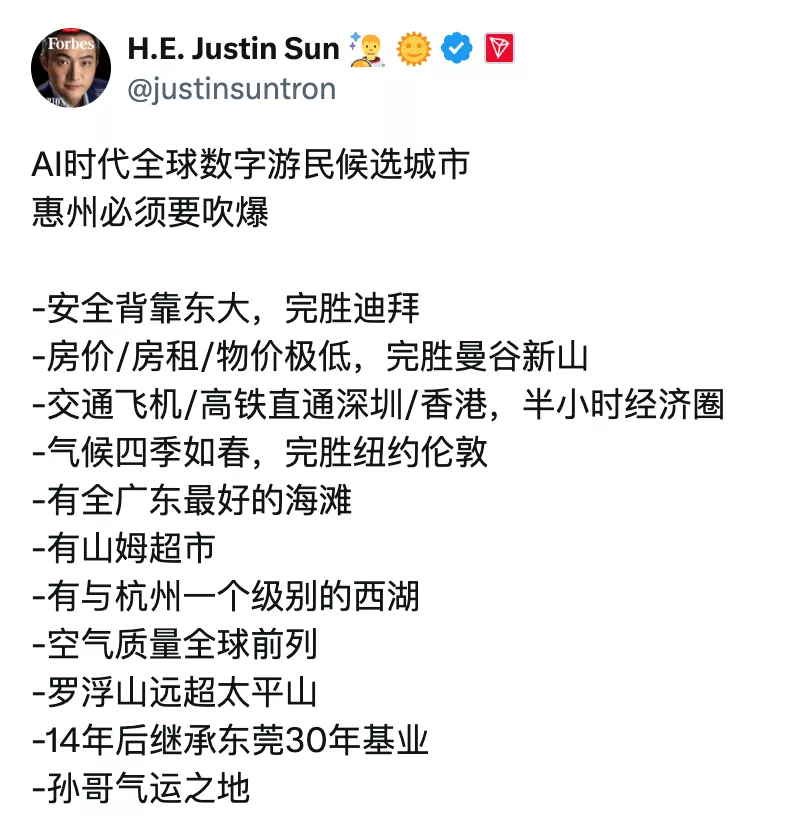 孙宇晨不是第一个推荐惠州的人。