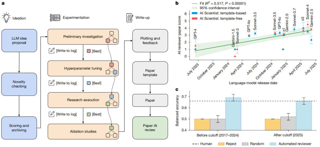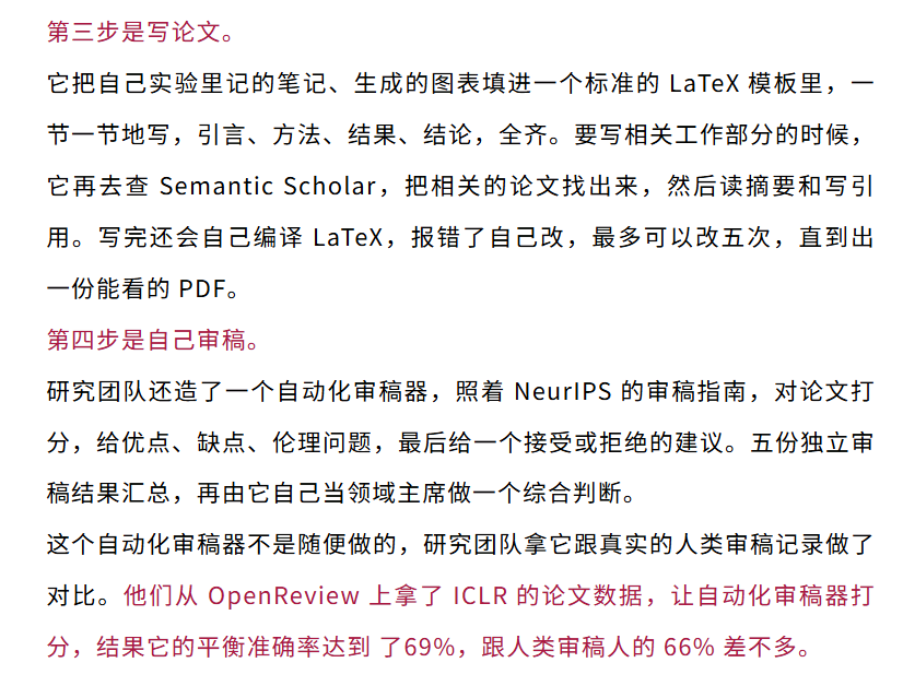 研究中,他们造出了一个叫 AI 科学家(AI Scientist)的系统,从想点子、写代码、跑实验、分析数据,到写论文、自己审稿,全由 AI 自己完成。