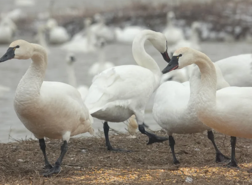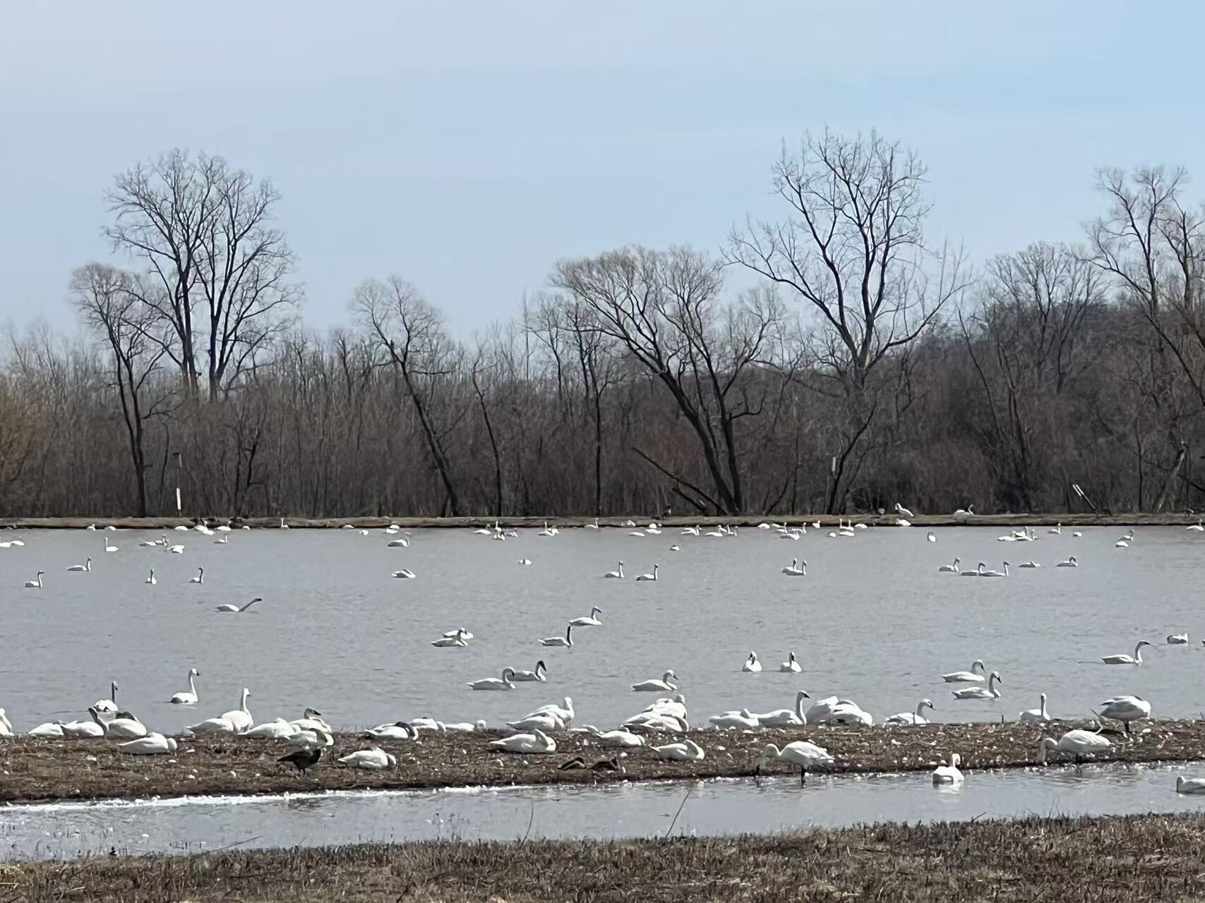 当地志愿者每天在池塘(Tundra Swan Pond)撒玉米,吸引天鹅集中停留。高峰期可达数千只(历史上单日峰值常在3000只左右)。3月25日有1300只,今年最高峰是3月18、19日,每天有2000多只。