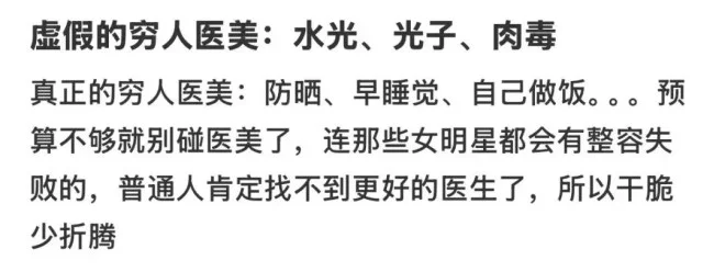 “曾经的穷人医美三件套,是水光、光子和肉毒。在一些医美机构,水光针和光子嫩肤一百块起步,再配上能祛皱、瘦脸的肉毒。一顿操作猛如虎,钱花了不到一千块,就能让自己肉眼可见地迅速变美。”