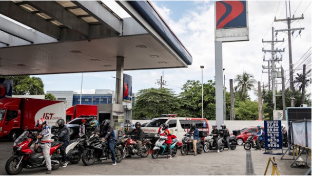 2026年3月9日,菲律宾马尼拉大都会奎松市,由于美国和以色列与伊朗发生冲突,预计油价将上涨,电单车司机在加油站排队加油。(Reuters)