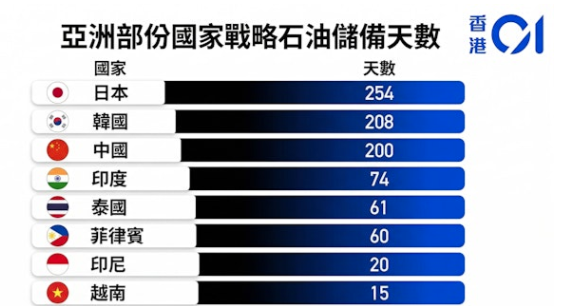 2026年3月24日,数据显示,亚洲各国的战略石油储备存量有显著差异。日本的石油储备相当于254日的使用量,韩国为208日,中国为200日。印度的石油储备相当于74日的使用量,泰国为61日,菲律宾为60日。印尼只有20日,而越南仅有15日的储备。(香港01)