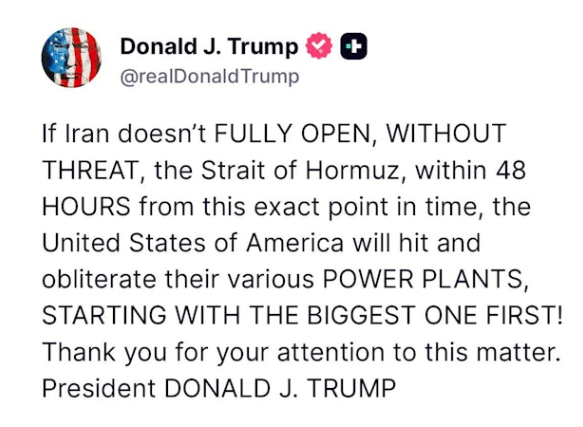 美国总统川普3月21日向伊朗发出警告,假如对方不在48小时解封霍尔木兹海峡,将向对方的发电厂发动袭击。