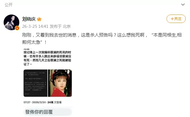 据红星新闻此前报道,3月25日,演员刘晓庆发文回应网传她“在横店游泳池里去世”的消息:“刚刚,又看到我去世的消息,这是杀人预告吗?这么想我死啊……”