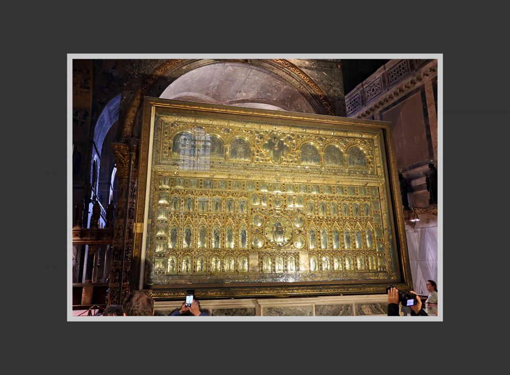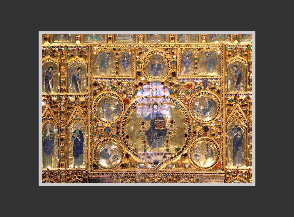 Pala d’Oro 是一件由黄金、镀金银板、掐丝珐琅(cloisonné enamel)和大量宝石构成的巨大宗教艺术品,约2.1 x 3.3米。它是在十至十四世纪间经多次扩建与重组完成,其珐琅板和珠宝也有复杂的来源。