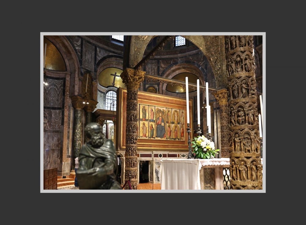我拍照片时候不知道,是去查的。这东东叫 Amboni,是个复数(单数:Ambone),圣马可大教堂内有左右一对,所以称为“双讲坛(amboni gemelli)”。它们是礼仪诵读台。它下部雕像或柱基支撑,显示拜占庭风格,与教堂金色马赛克背景形成呼应。