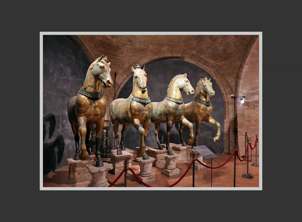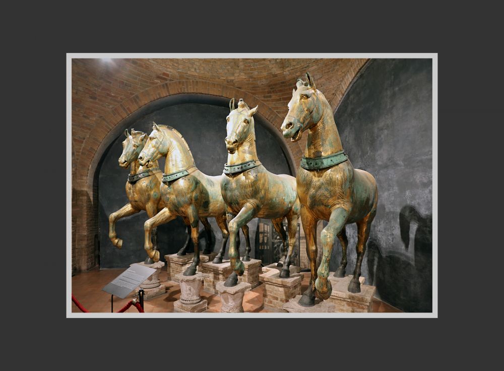 这四匹马过去一直陈列于圣马可大教堂二楼露台上,作为威尼斯政治和文化象征。然而在40多年前,原件被移到室内(就是前面几张照片显示的),教堂的露台上换上了复制品。原来,1960-1970年代,威尼斯空气污染严重,酸雨导致四铜马表面的镀金层快速剥落。专业评估认为,如果继续露天陈列会造成不可逆损害。于是有关方面决定,将真品移入室内,露台改用高质量复制品。