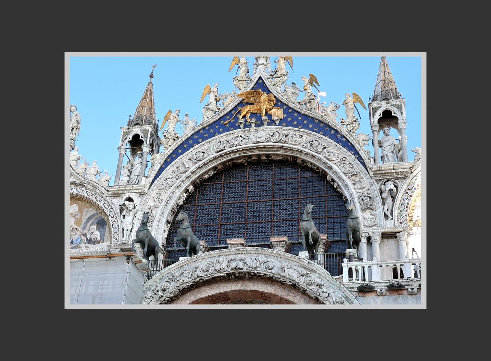 几可乱真的复制品,由意大利米兰的巴塔利亚艺术铸造厂(Fonderia Artistica Battaglia)用几年时间完成。1982年,四匹全新的镀金铜复制马,被正式安装在圣马可大教堂的露台上。