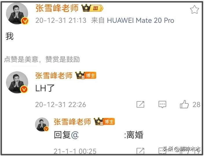 2020年的最后一天,张雪峰在微博官宣自己离婚,具体原因并没有多说,甚至一开始离婚还用的拼音缩写,似乎并不想闹大,怕影响孩子。