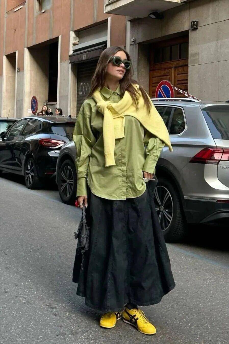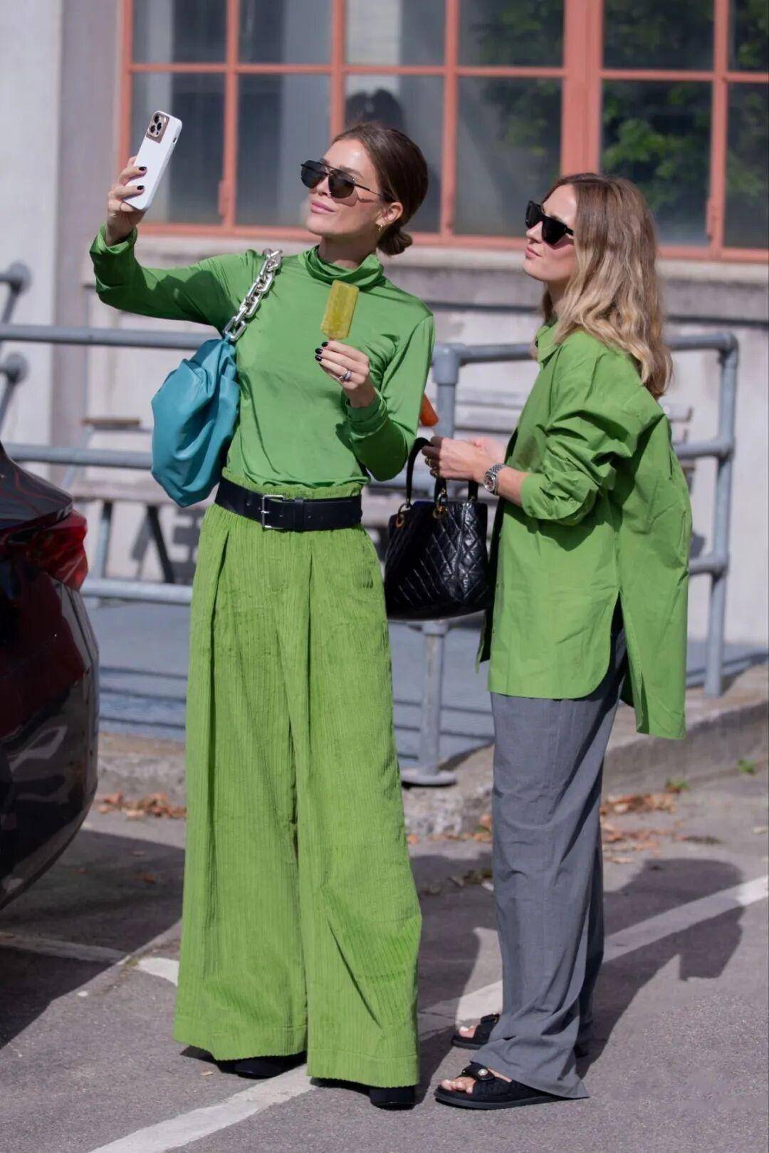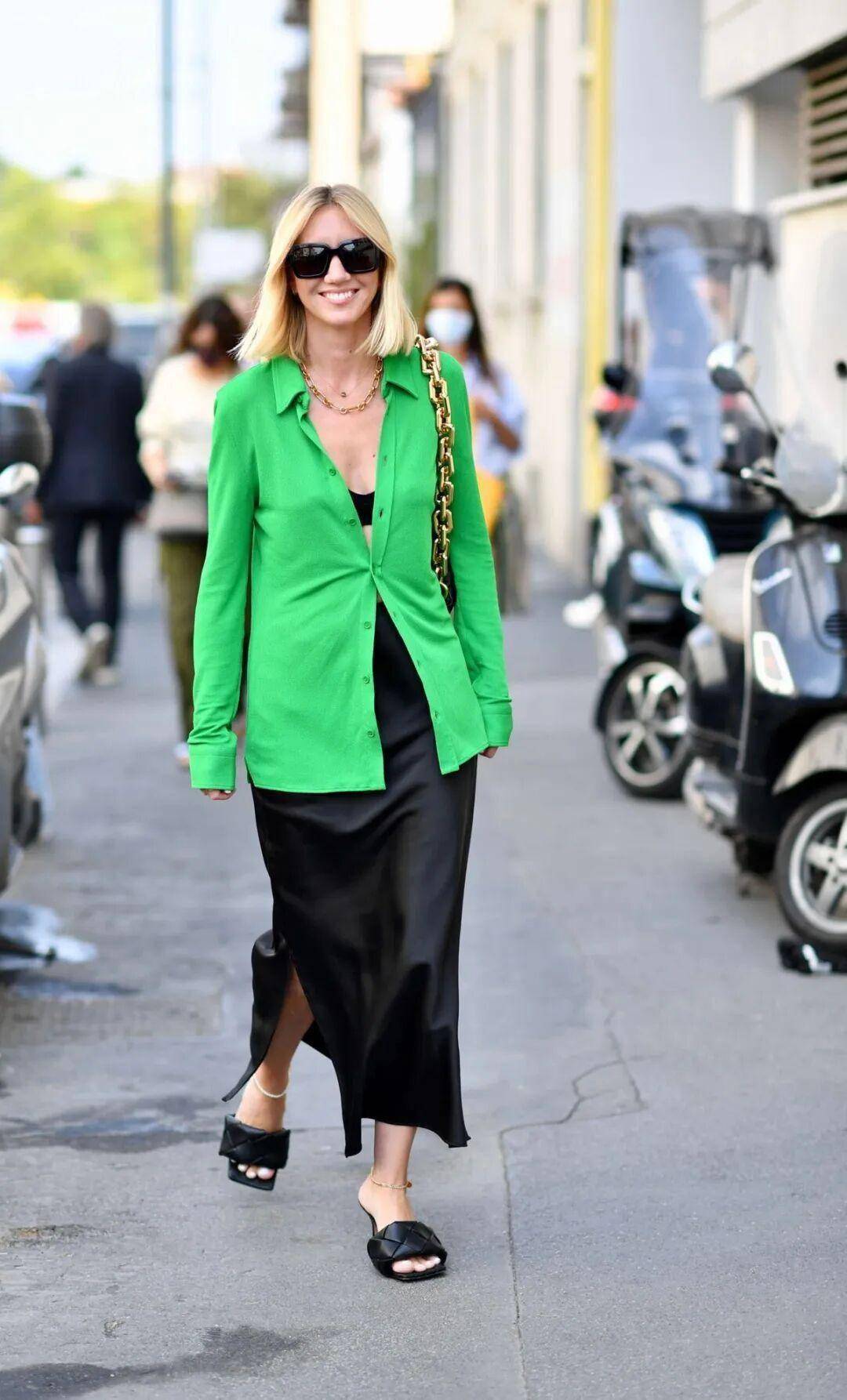 绿色包包、鞋子、首饰,与衣物形成肌理反差,光泽感配饰为简约造型加分。