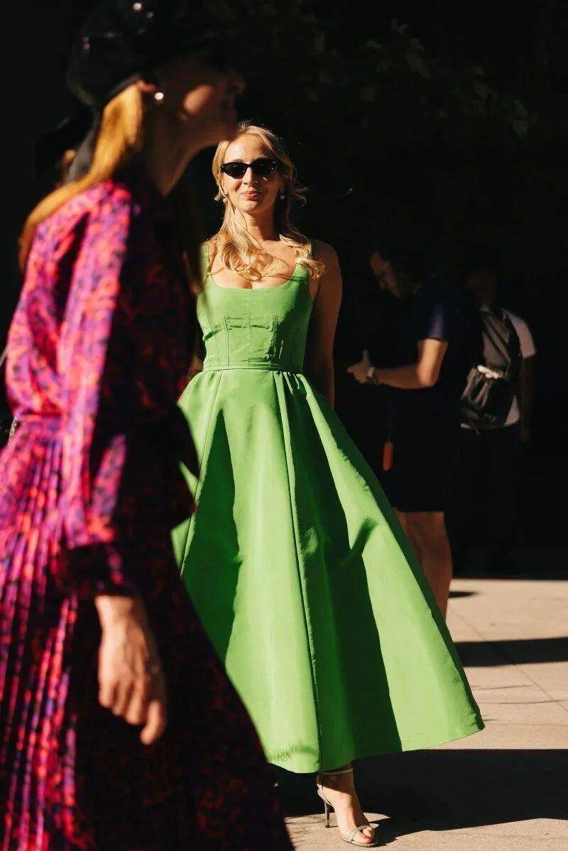 垂顺的格林系缎面裙摇曳至小腿,如流水般温润,即便阴天也能驱散沉闷,搭配黑色西装,刚柔碰撞氛围感拉满。