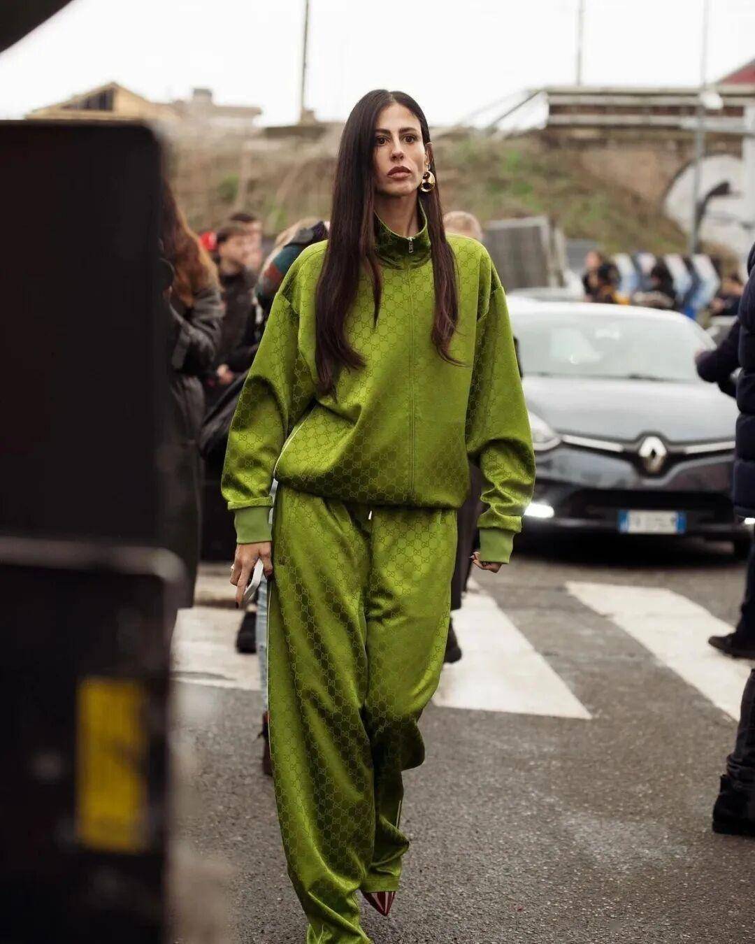 薄绒运动套装适配微凉的早春,丝质夹克套装契合升温的暮春,复古绿调加持,随性又时髦。