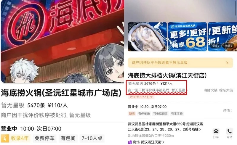 海底捞部分门店星级在大众点评上不予展示。图源网络